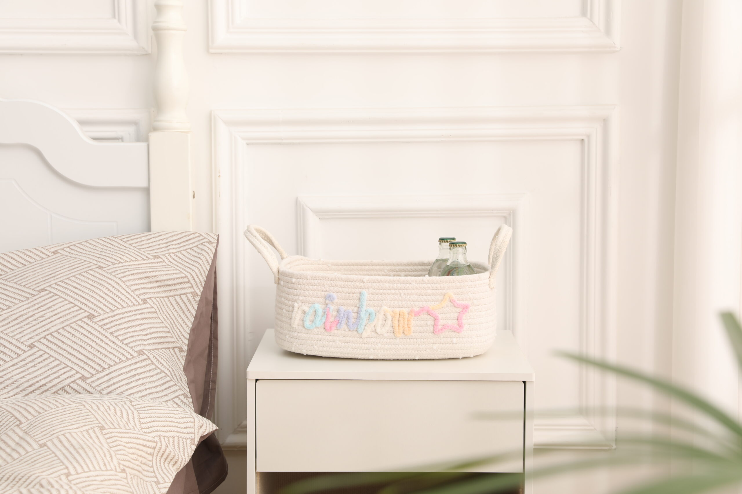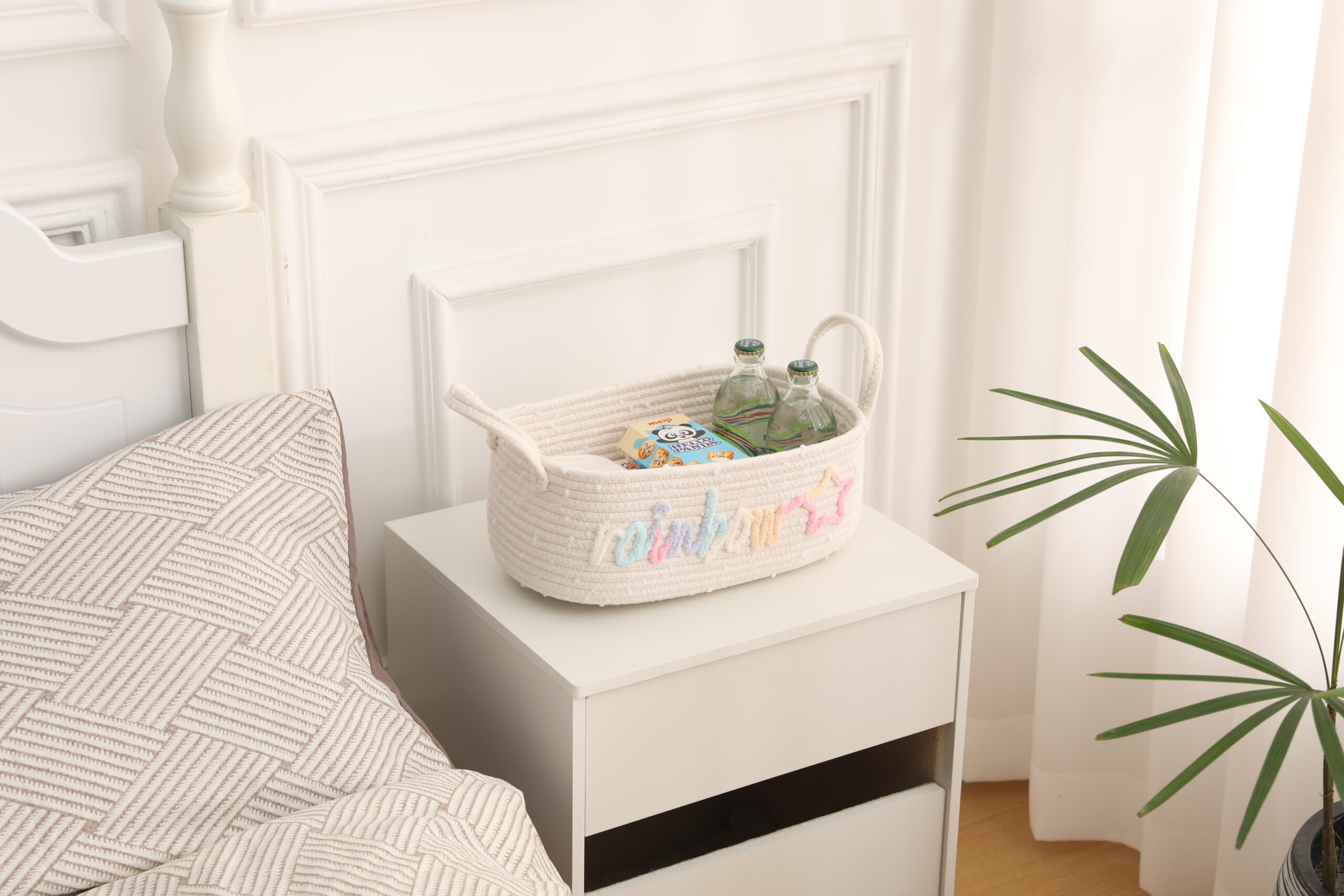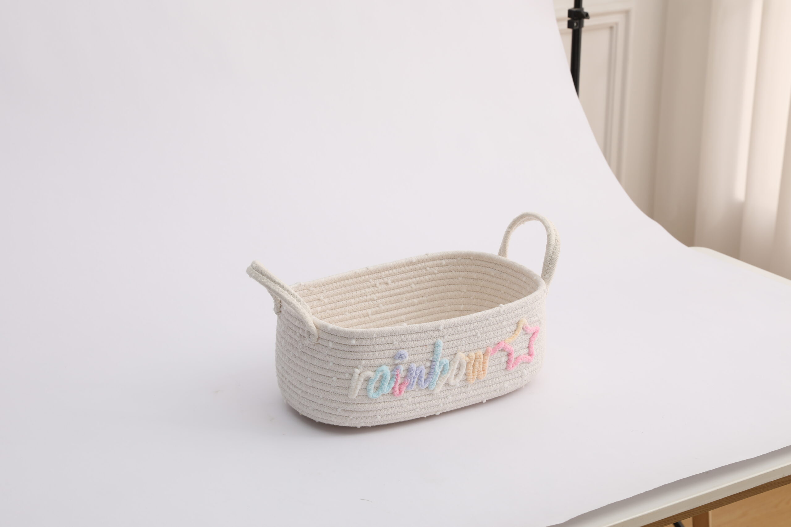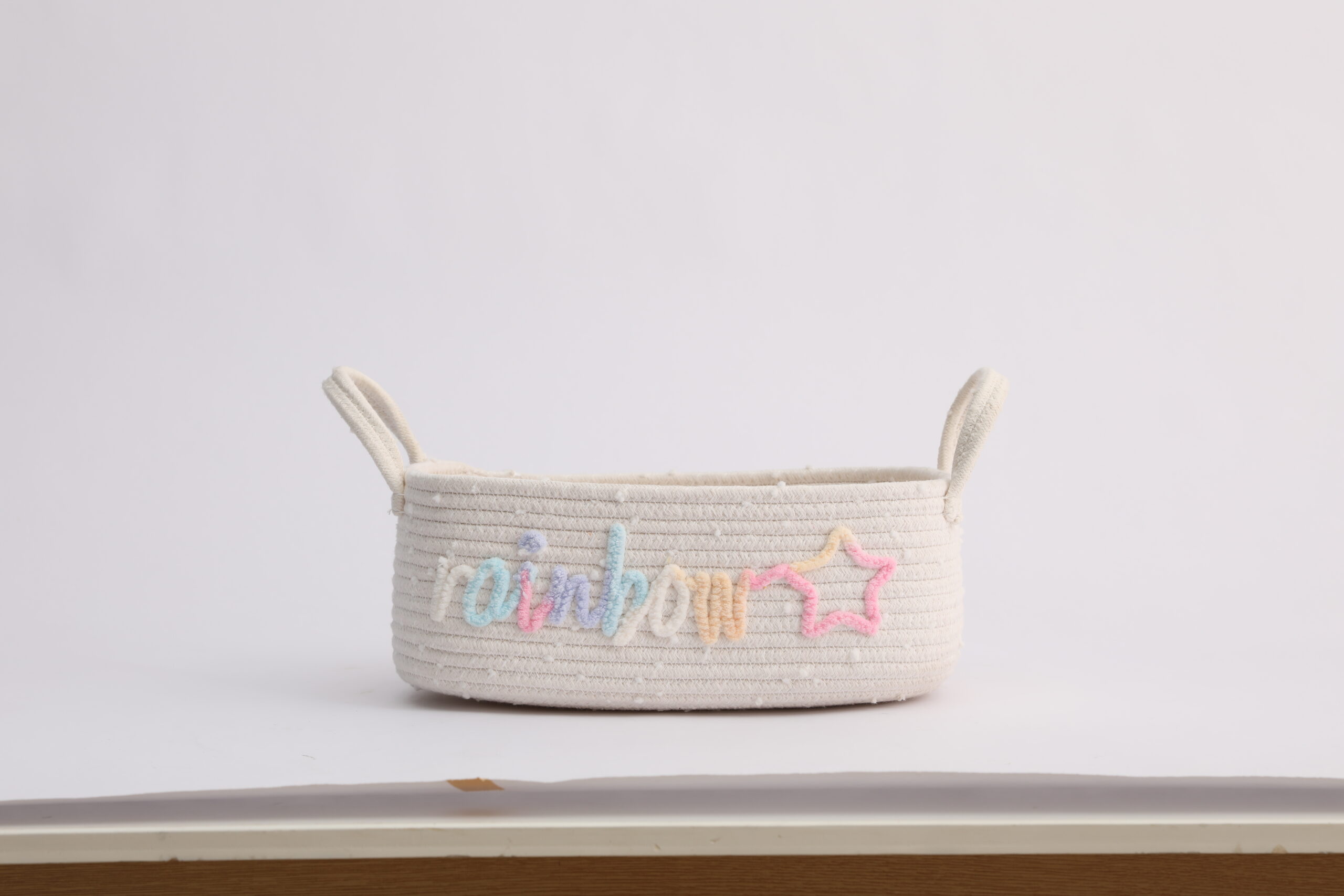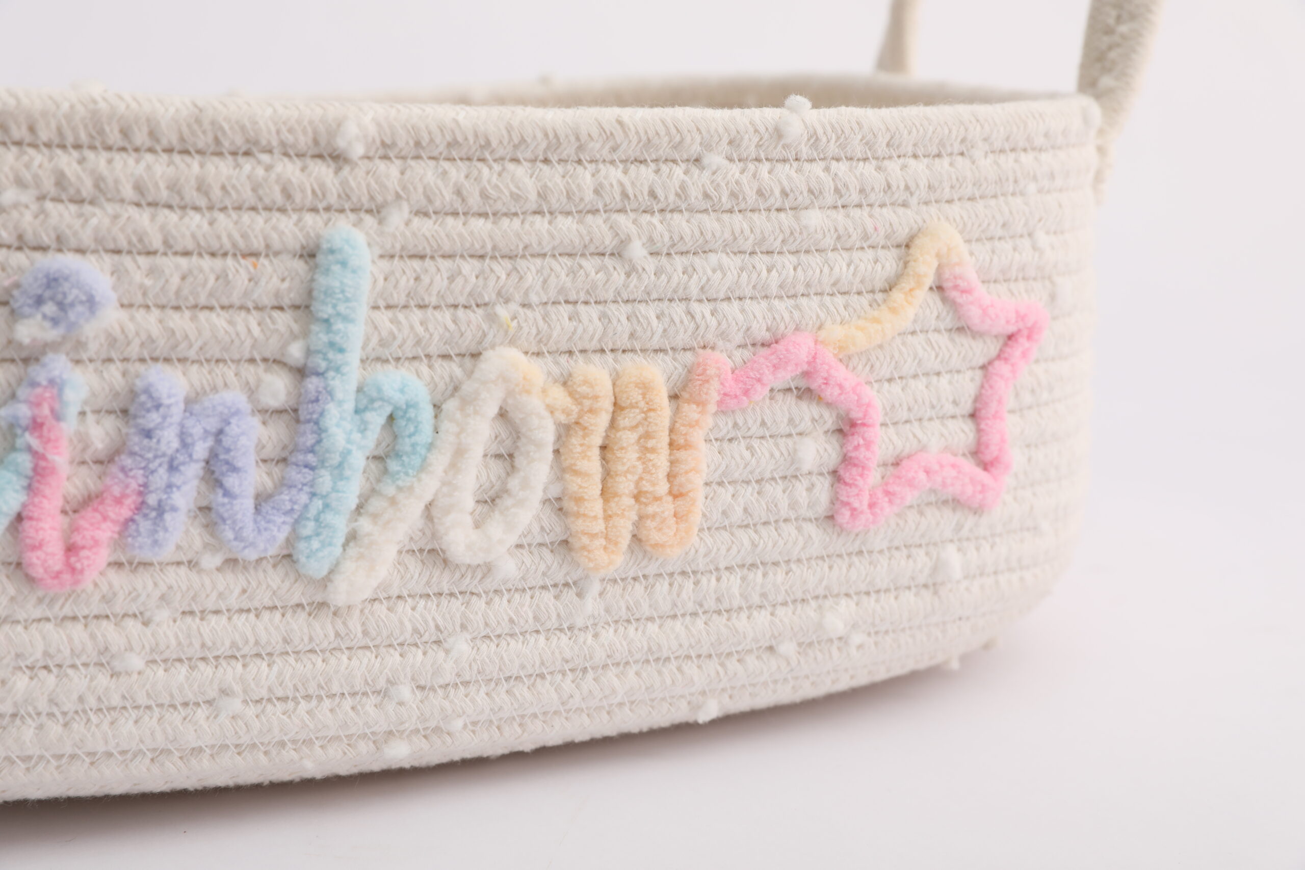 Made of soft, skin-friendly natural cotton rope, this storage basket is durable, odor-free, and gentle on delicate items. The unique rainbow “rainbow” and star embroidery design adds a playful, bohemian touch to any space, perfect for kids’ rooms and aesthetic home decor.