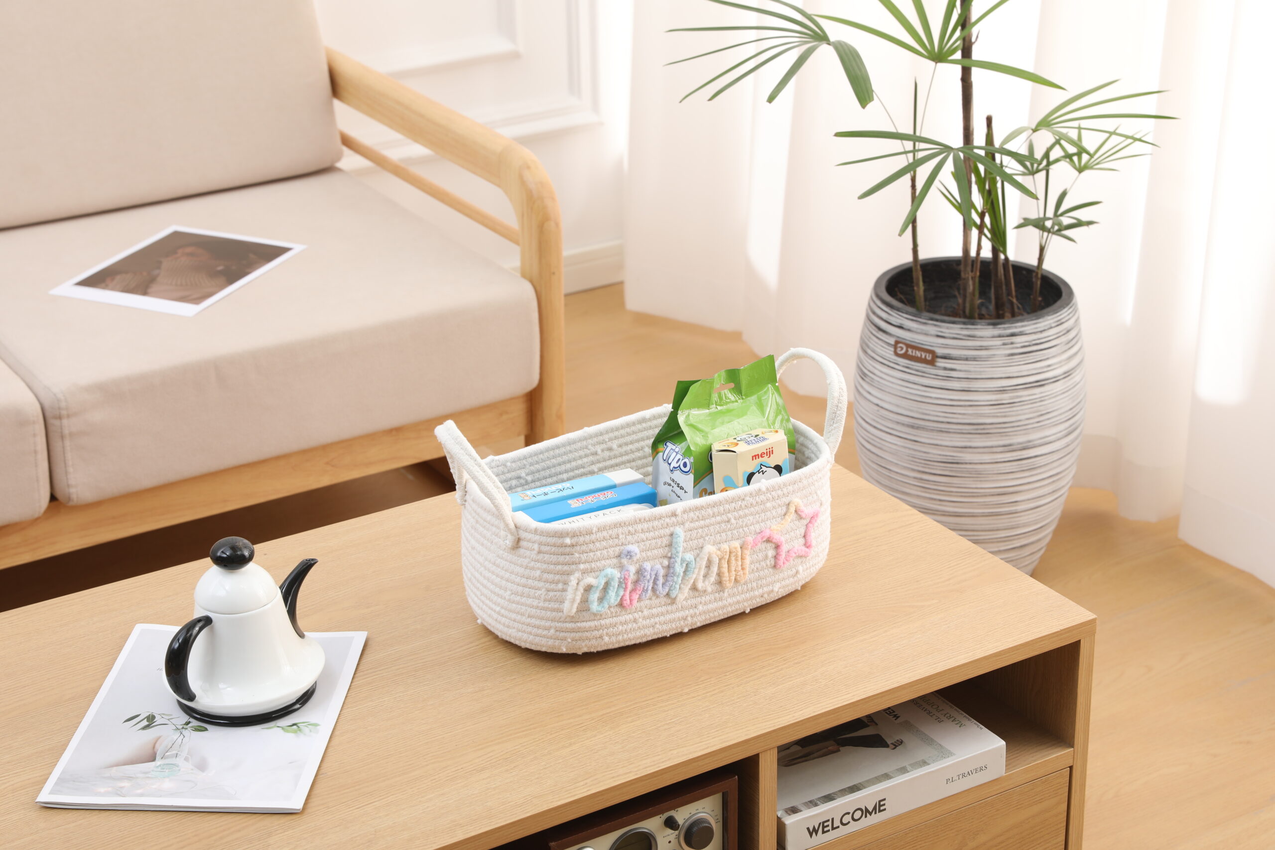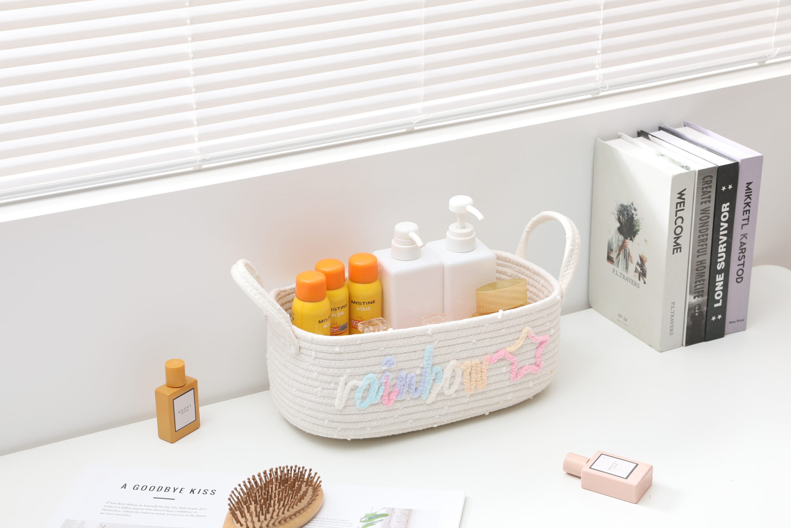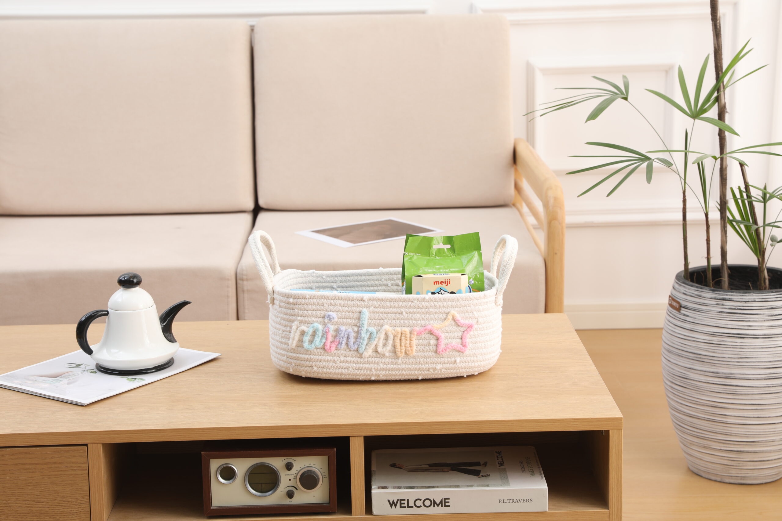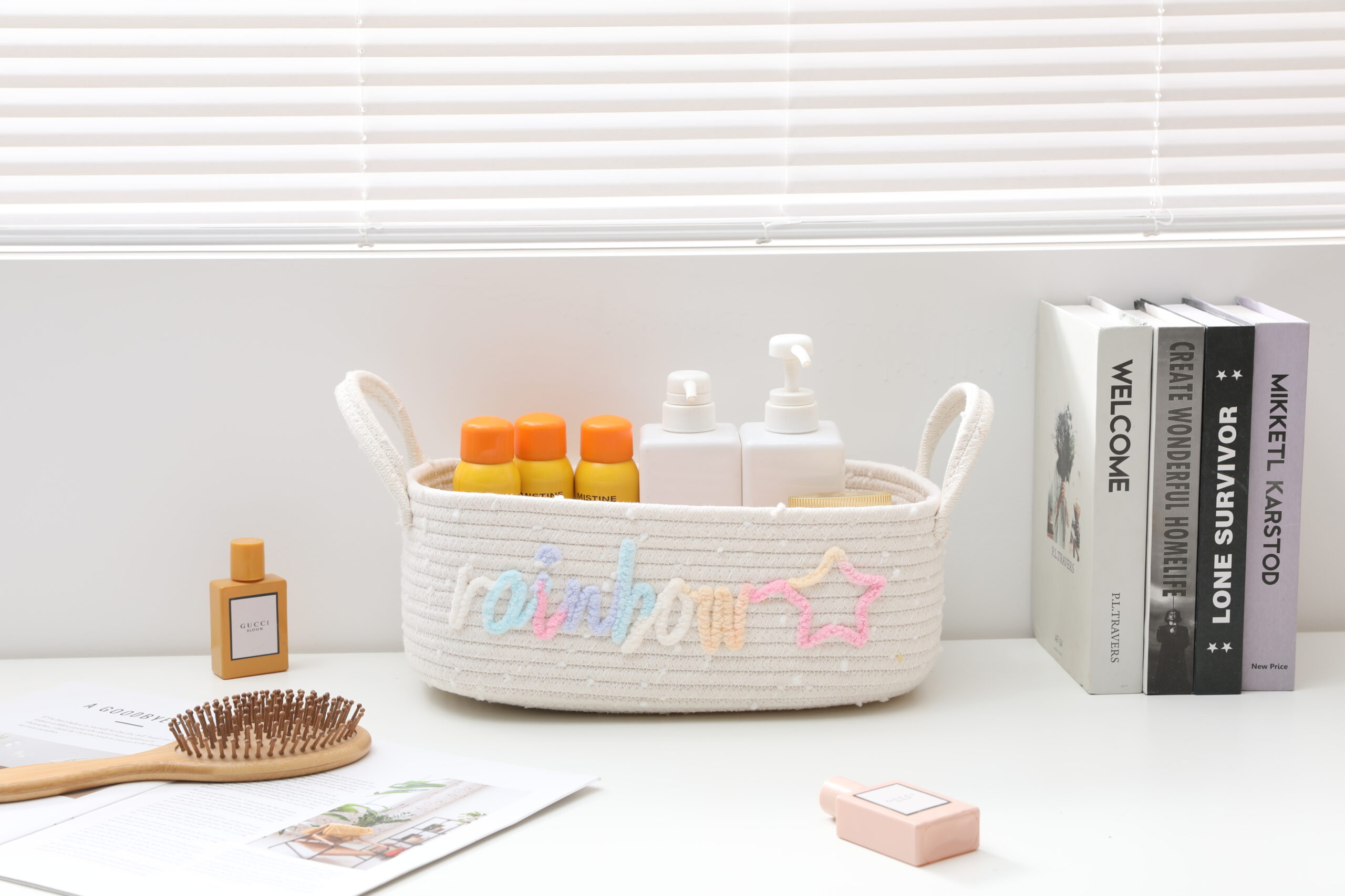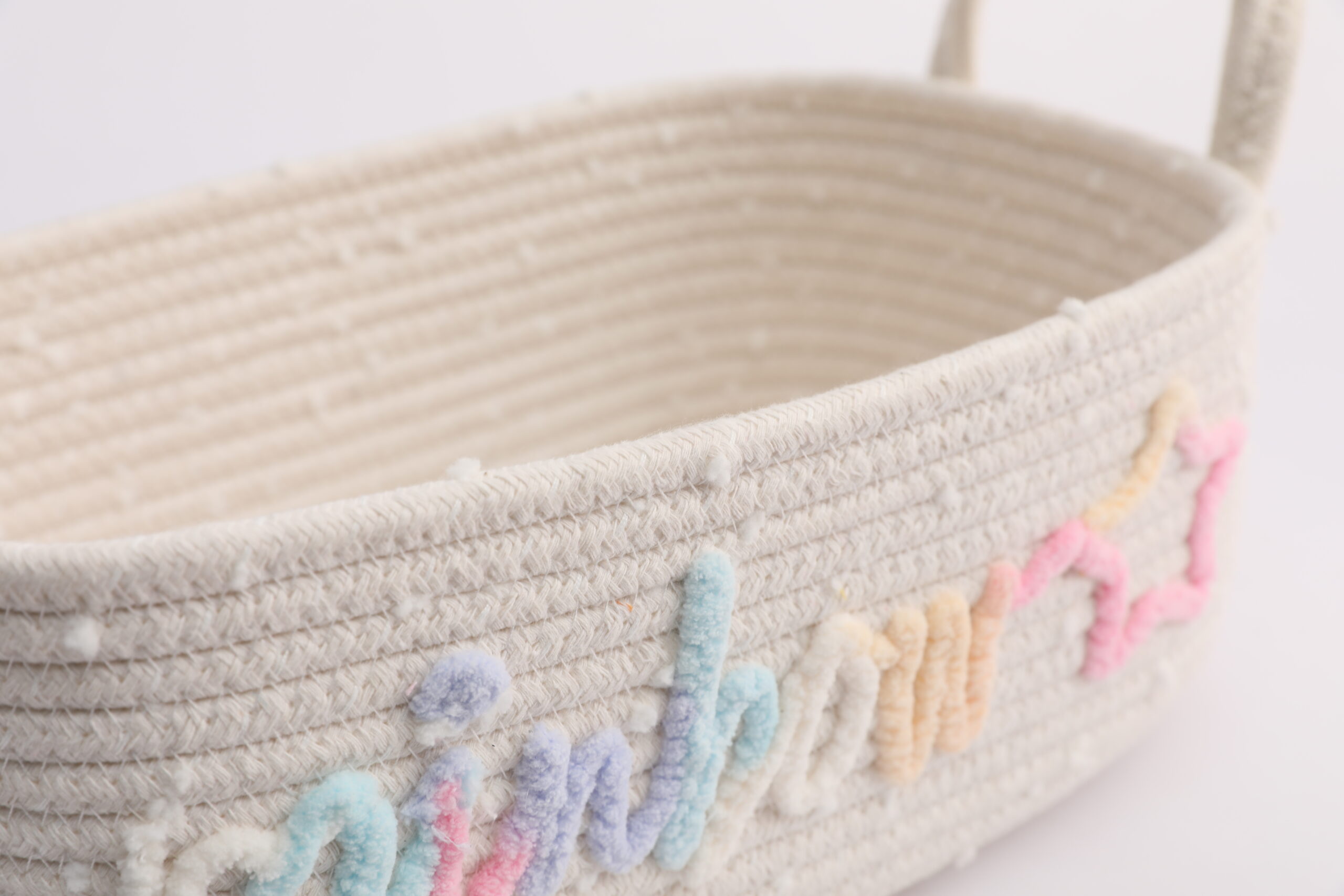 Made of soft, skin-friendly natural cotton rope, this storage basket is durable, odor-free, and gentle on delicate items. The unique rainbow “rainbow” and star embroidery design adds a playful, bohemian touch to any space, perfect for kids’ rooms and aesthetic home decor.